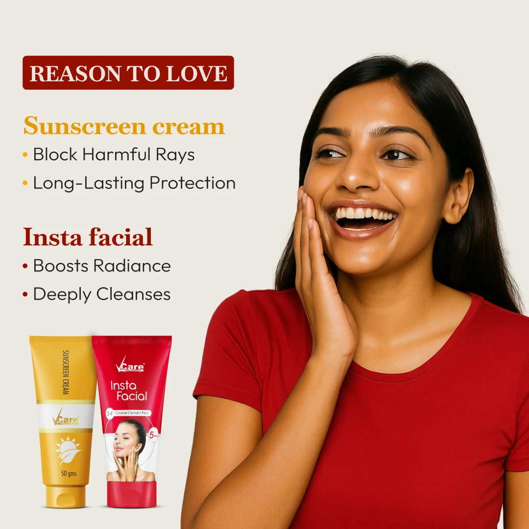 Get Clear skin and protect it from daily sun exposure with this skincare power duo. The VCare Insta Facial 3-in-1 deeply cleanses, exfoliates, and brightens, while the VCare Sunscreen SPF 30+ protects your glow from harmful UV rays. One combo, two essentials for naturally glowing and protected skin—every single day.