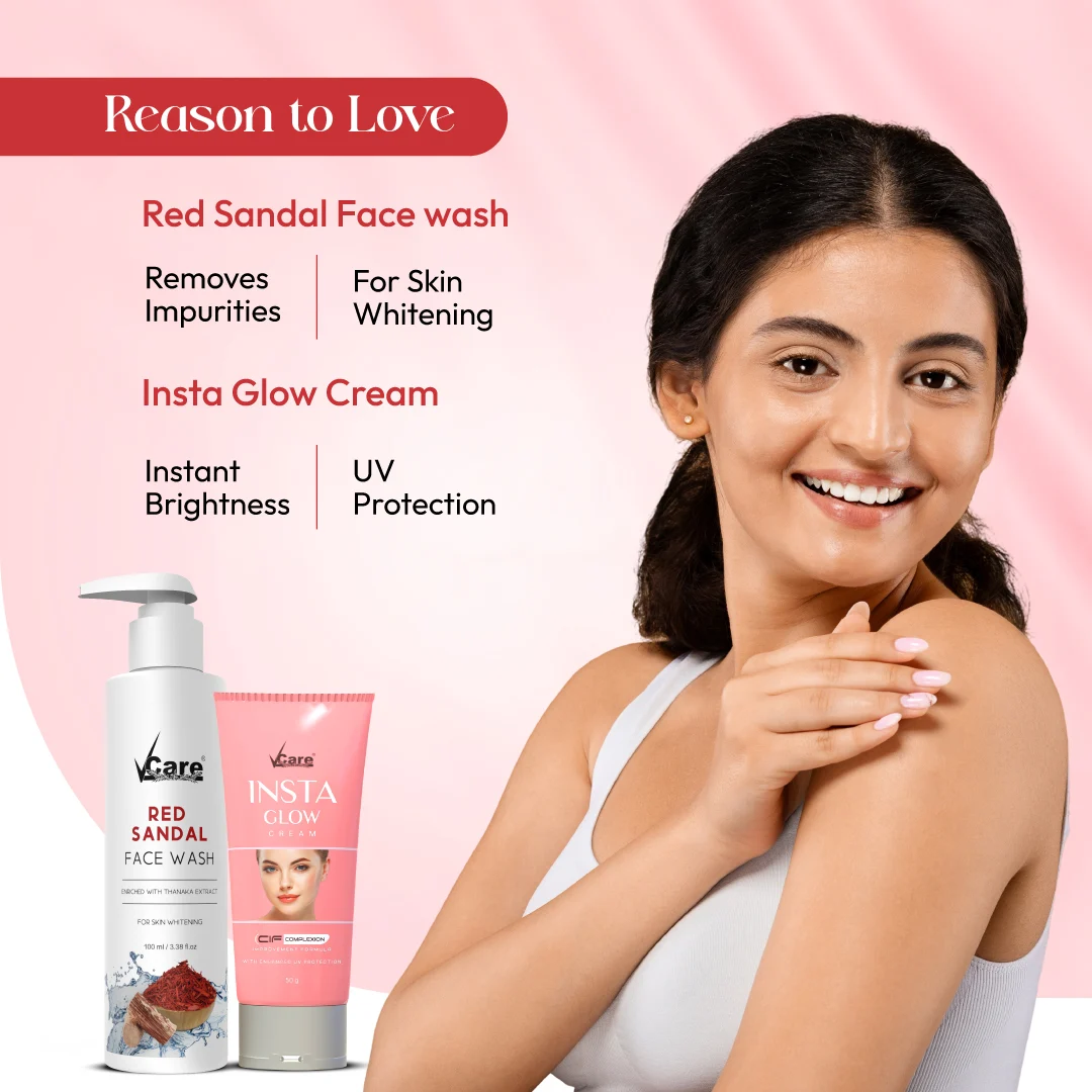 A power-packed skin care combo featuring VCare’s Red Sandal Face Wash and Insta Glow Cream. Gently cleanses, brightens, and hydrates your skin for a naturally radiant, even-toned glow—every day