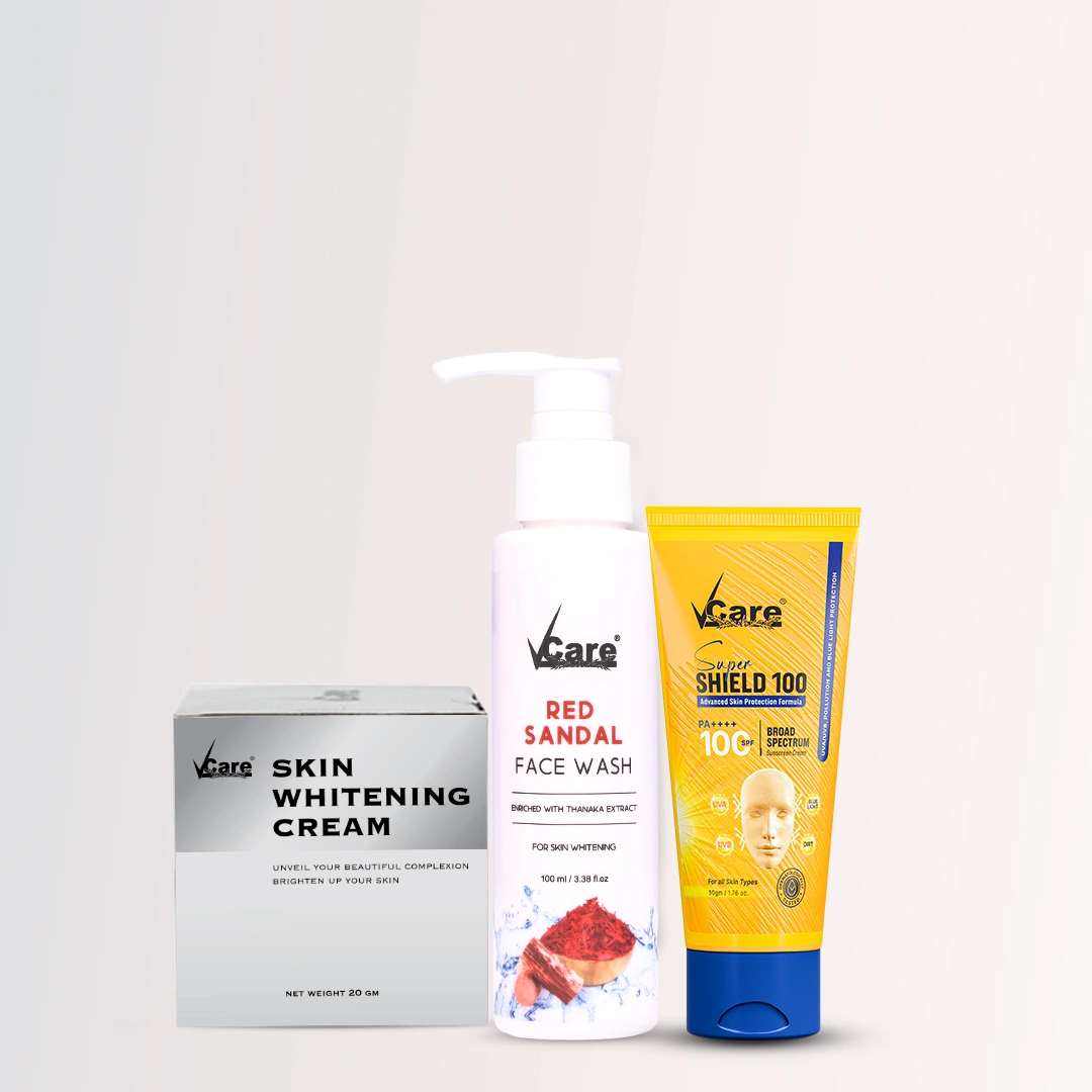 Achieve visibly brighter, clearer, and glowing skin with the VCare Skin Whitening Combo — a complete skincare routine designed to lighten pigmentation, reduce tan, protect from sun damage, and improve overall skin health. Enriched with Red Sandalwood, Thanaka, Licorice, and Marmesin, this gentle cleanser removes dirt, oil, and impurities while reducing tan and dullness. Its anti-inflammatory and anti-bacterial properties help control acne, tighten pores, and improve skin clarity. Your skin feels fresh, clean, and naturally bright after every wash. This powerful brightening cream is formulated with Glabridin, Songyi Mushroom Extract, Niacinamide, and 3-O-Ethyl Ascorbic Acid to lighten dark spots, reduce pigmentation, and even out your complexion. It deeply hydrates dry skin, improves texture, and boosts natural radiance. Best used at night for enhanced absorption and quicker results. A lightweight, non-sticky sunscreen that shields your skin from UVA, UVB, and blue light exposure. It prevents tanning, darkening, and pigmentation while keeping the skin hydrated and smooth. No white cast — perfect for daily use and essential to maintain your brightened skin tone.1. Red Sandal Facewash – Cleanse & Brighten